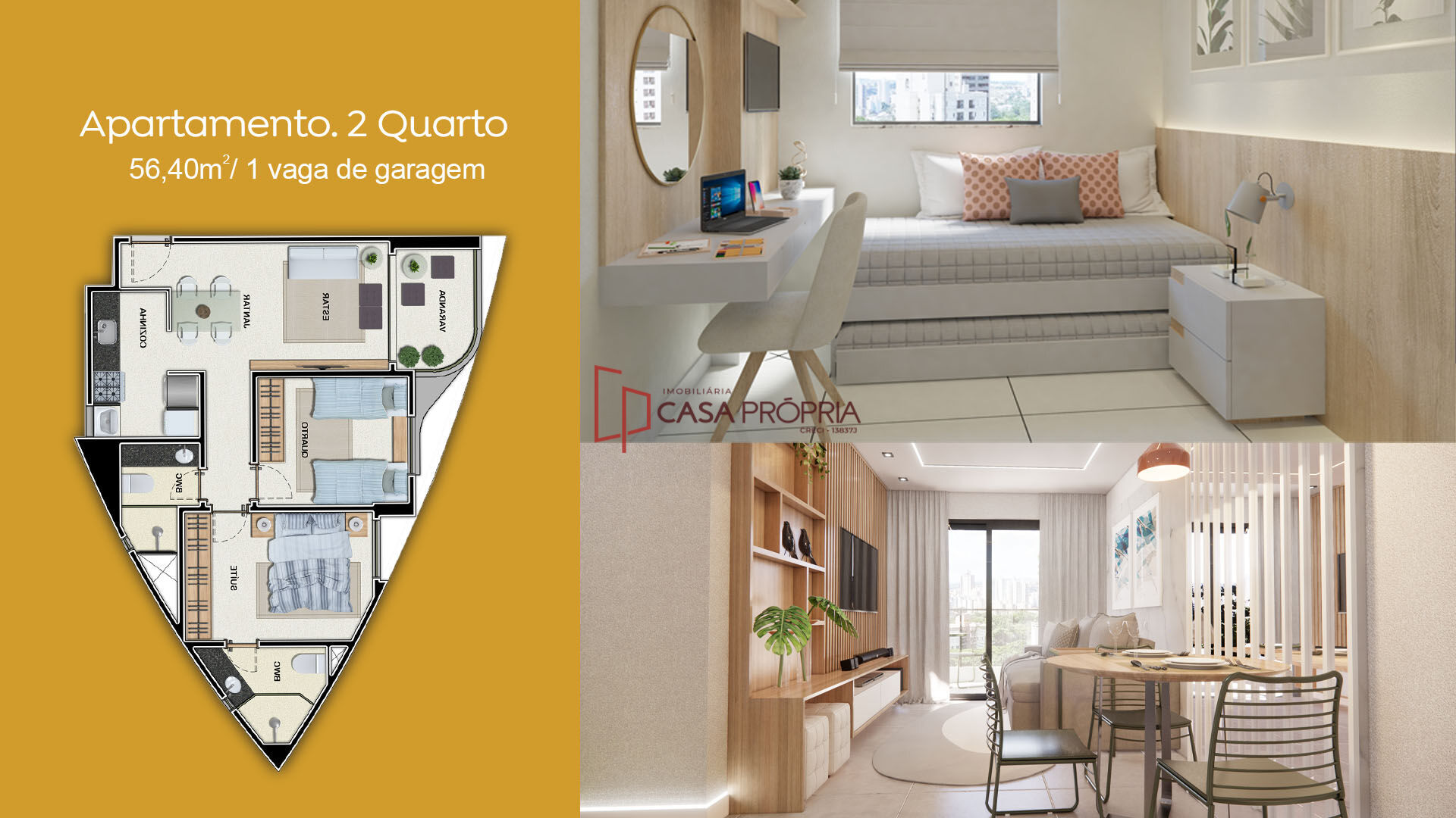 2 Dormitórios, sendo 1 suíte1 Banheiro1 Vaga1 Cozinha1 Sala de jantar1 Sala de estar